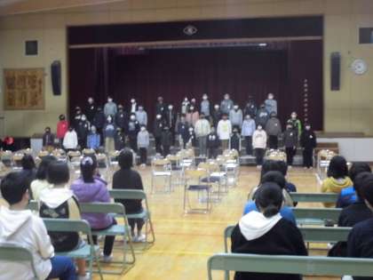 いよいよ卒業式が近づいてきました。今日は卒業式の予行をしました。当日は5年生は参加できないので、卒業式の雰囲気を味わい、お祝いの気持ちを伝えるため5年生も参加しました。6年生は立派にやり遂げ、5年生も静かに落ち着いた態度で参加していました。