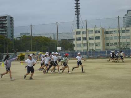 5年生は棒を使ってグループでの活動です。しっかりとタイミングを合わせて走っていました。
