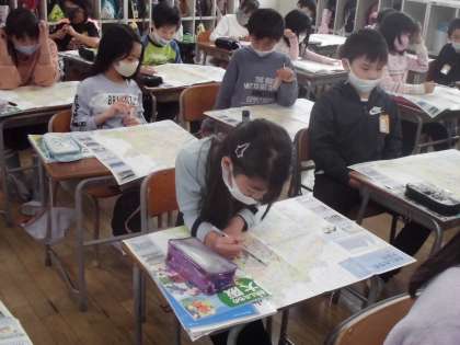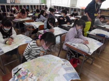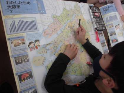 3年生は社会科で大阪市の地図を使っての学習です。住之江区はもちろん、大阪市の各区について名称や位置を確認していきました。