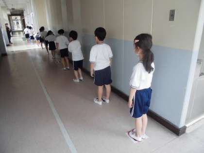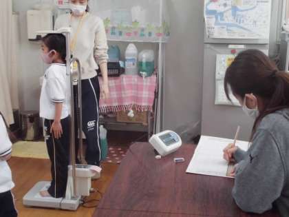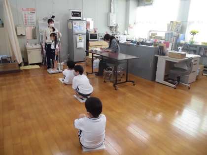 1年生は何事も初めてです。今日は身体測定をしました。体操服に着替えて保健室前に密を避けるため間隔を開けて並びました。この測定器は身長と体重を同時に測り、担任の前のモニターに数値が表示されます。