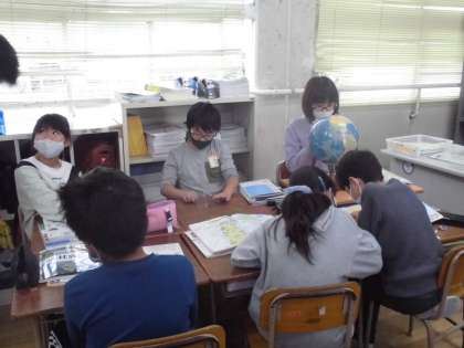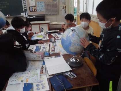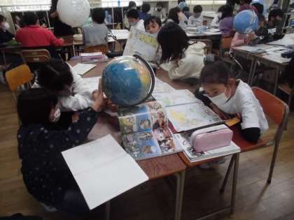 5年生は社会科の学習で、地球儀と地図帳で世界の国々の名前と位置を確認していきました。グローバルな社会に合った学習です。