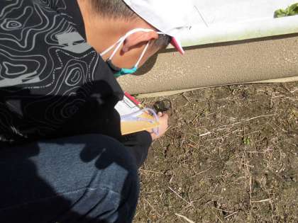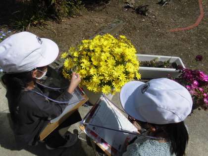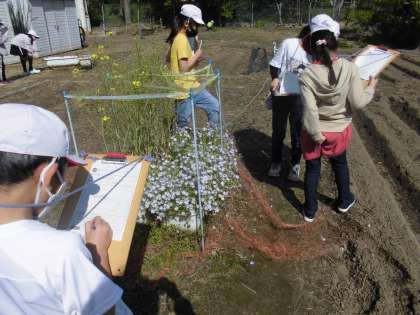 3年生は虫メガネを使って虫や花の観察です。見たことを絵と文でまとめていました。