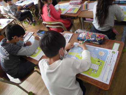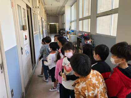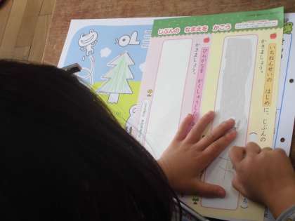 1年生は鉛筆で線を書く練習をし、自分の名前を書きました。しっかり鉛筆を持ち、名前を書いていきました。その後、校内巡りをしました。