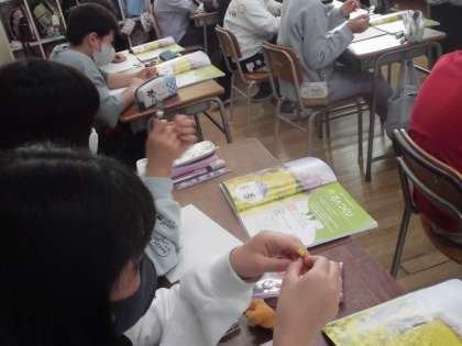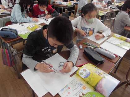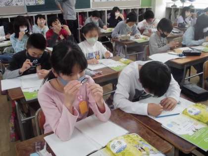 5年生は菜の花を観察しました。虫眼鏡で花のつくりをしっかり見てスケッチしていきました。その後、ピンセットで花を「がく」や「はなびら」などにわけていきました。