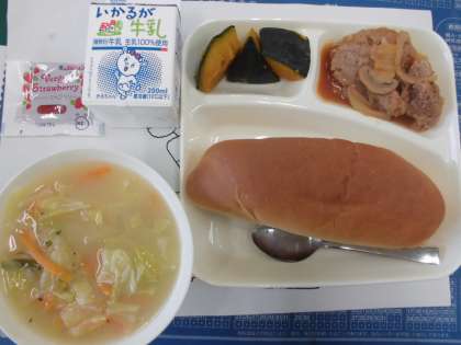 4月19日の給食は「煮込みハンバーグ」「コーンスープ」「やきかぼちゃ」です。ハンバーグは給食だけでなく子どもたちは大好きですね。