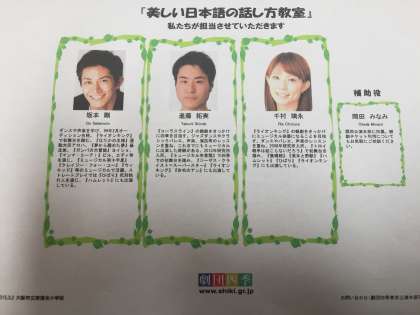 2日、劇団「四季」から坂本 剛さん、進藤拓実さん、千村璃永さんをお招きしました。みなさん、ライオンキングをはじめとして、活躍されている方々で、めったに出会えない貴重な体験となりました。母音の発語を中心に、5・6年生に美しい日本語の話し方を教えていただきました。