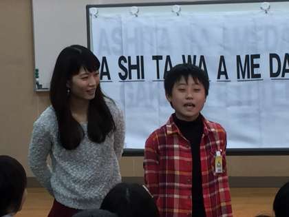 日本語は母音をきちんと発音することが、大切だと教えていただきました。子音をとって母音だけで発音してみて、それがよくわかりました。最後は「友だちはいいもんだ」を全員で歌い、なごやかな時間を終えました。
