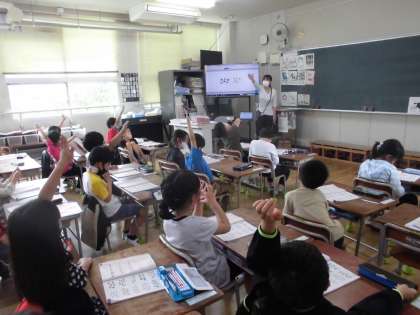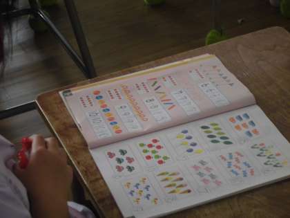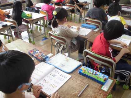 1年生は数字の学習を進めています。花や車などの絵で数を数えて、数字を書いていきました。