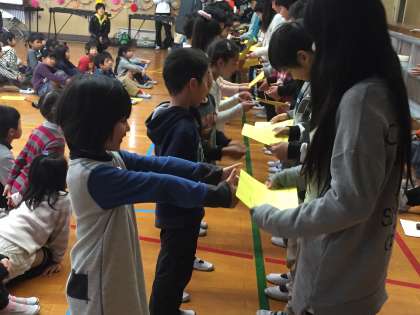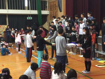メッセージカードを1年生から、たてわり班のリーダーに贈りました。6年生からは、学校をきれいにしてほしいという願いをこめて、あたらしい雑巾が、在校生に贈られました。