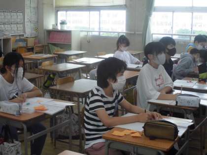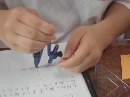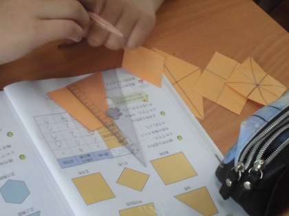 6年生は「対称」の学習の続きです。今日は折り紙で図形を作り、線対称になるように線を書いていきました。線対称になるようにコンパスを使って左右の線が同じになるように作図していきました。