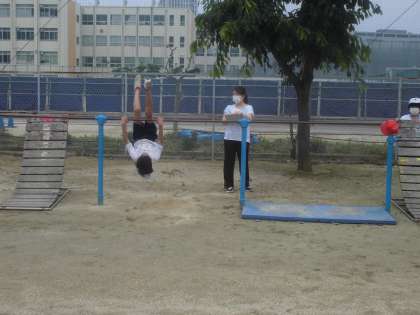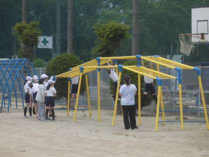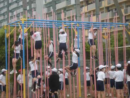 6年生は「腕だめし」です。「うんてい」「鉄棒」「のぼり棒」に取り組みました。なかなか難しいと感じる子どもたちもいましたが最後まで頑張ろうと努力していました。