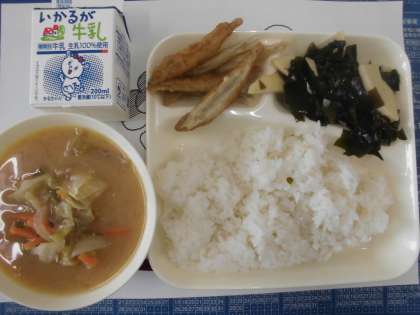 5月24日の給食は「きびなごの天ぷら」「豚汁」「わかたけ煮」です。たけのこは今が旬で、柔らかい食感でわかめとの相性もとてもよかったです。