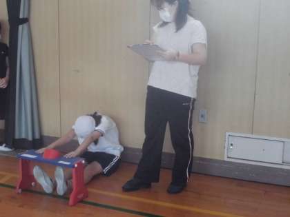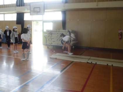 6年生は体育館で体力テストをしました。今日は「長座体前屈」の測定です。少しでも記録を伸ばそうと必死に体を曲げていました。また、幅跳びの練習にも取り組んでいきました。