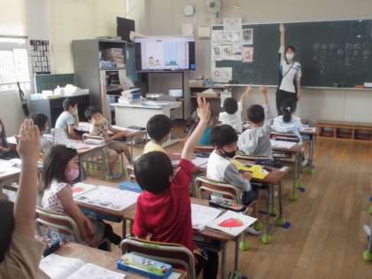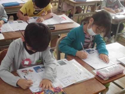1年生は「ひらがな」の学習も進み、今日は書き方がむずかしい「ぬ」です。書き方を教えてもらい、「ぬ」のつく言葉を発表し合ってから姿勢に気をつけて書いていきました。
