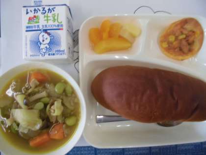 5月26日の給食は「豚肉と野菜のカレースープ煮」「変わりピザ」で缶詰のミックスフルーツがでました。