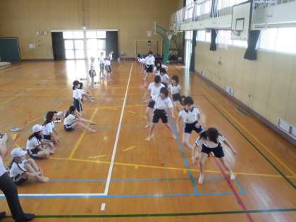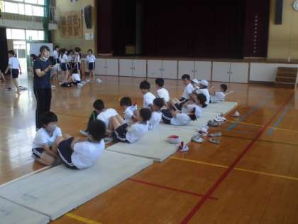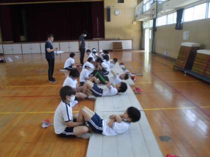 5年生は体育館で「上体起こし」と「反復横跳び」をしました。歯を食いしばって体を起こす姿は真剣そのものです。「反復横跳び」はリズムをうまくとるのがむずかしそうでした。
