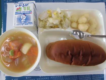 6月2日の給食は「いか天ぷら」「フレッシュトマトのスープ煮」「サワーソテー」です。いか天ぷらは食べやすい一口サイズでとてもおいしくいただきました。