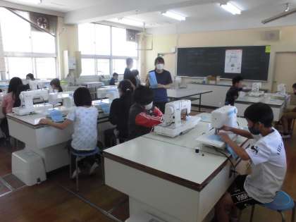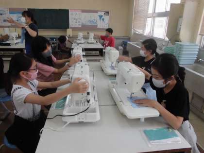 5年生は家庭科で初めてミシンを使いました。使い方や注意事項を教えてもらい、練習布で空縫いをしました。おそるおそるペダルを踏むなど慎重に操作していました。次回からは糸を通して縫っていきます。