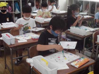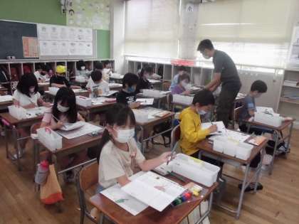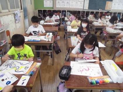 3年生は絵の具を使った学習です。絵の具の出し方、パレットの使い方など基本を確認しながら、線を描いていきました。