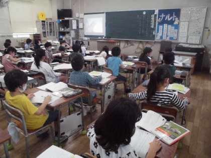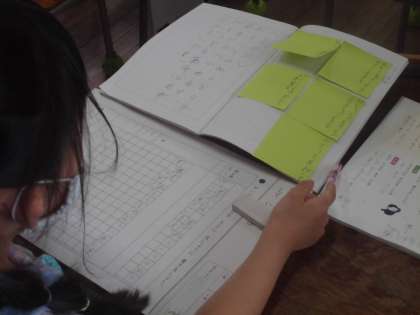 2年生は作文の学習です。テーマは「家でしていることを伝えよう」です。写真のように付箋に要点のメモを書き、わかりやすく伝えようとよく考えて文章にしていきました。