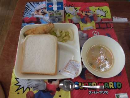 6月9日の給食は「サーモンフライ」「豆乳スープ」「キャベツのソテー」と食パンです。食パンはリンゴジャムでいただきました。サーモンフライはサクッとした食感でおいしくいただきました。