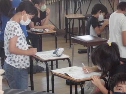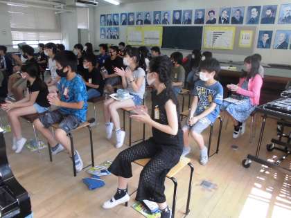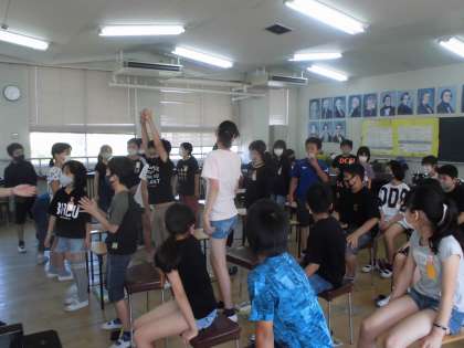 5年生は楽曲の譜面の読み方を確認していました。そのあとは「線路は続くよ」の音楽に合わせて手拍子を打ち、順番に立ったり座ったりして楽しく学習しました。