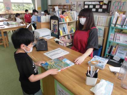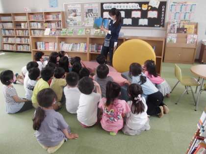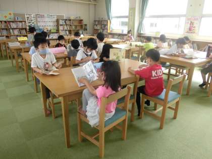 1年生は梅雨バージョンの図書室に行きました。本を読んだり借りたりしていました。担任の先生から絵本を読んでもらってご機嫌です。