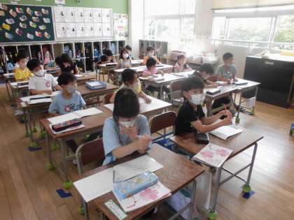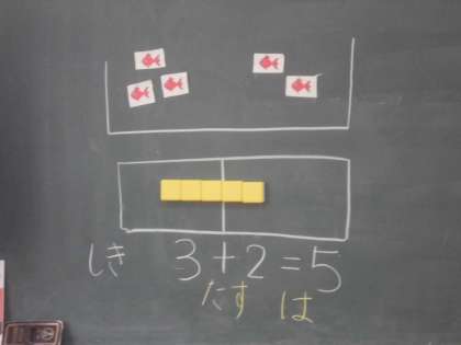 1年生は足し算を習っています。今日はノートに初めて「+」「=」を使って式と答えを書きました。
