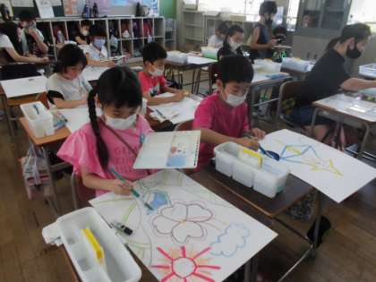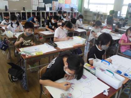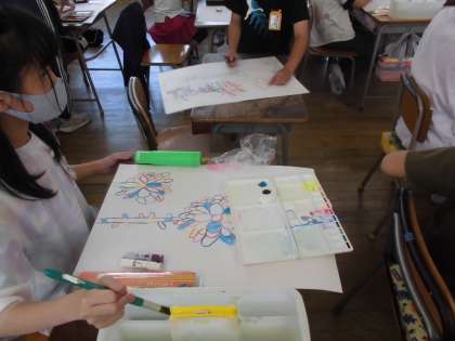 4年生は「まぼろしの花」の題材で想像の花を描いていきました。パスで形を描き、絵の具でていねいに描いていきました。いろいろな花が教室の中で咲いていて、見ていて楽しくなりました。