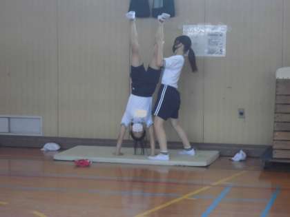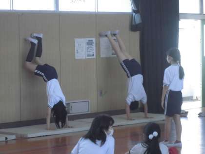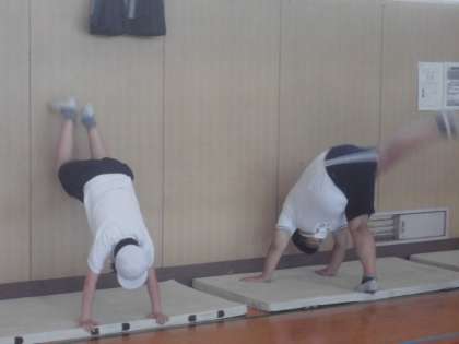 6年生は倒立の練習です。壁に向かって練習していきました。二人組で練習したり工夫していました。