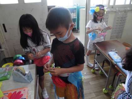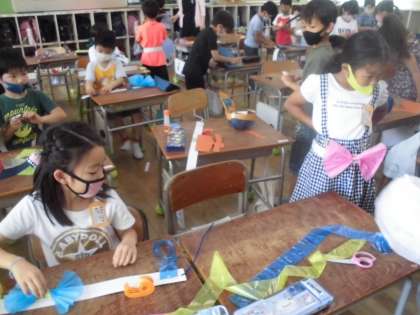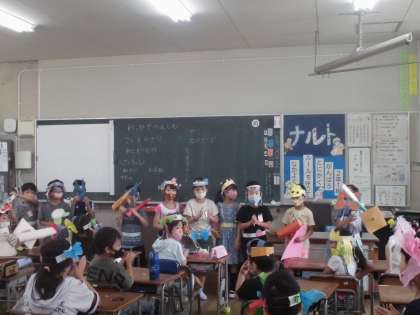 2年生は図工で画用紙や折り紙で輪を作り、飾りをつけて頭や体につけて楽しみました。きれいな装飾ができ、グループごとに前に出てみんなで見せ合いをしました。