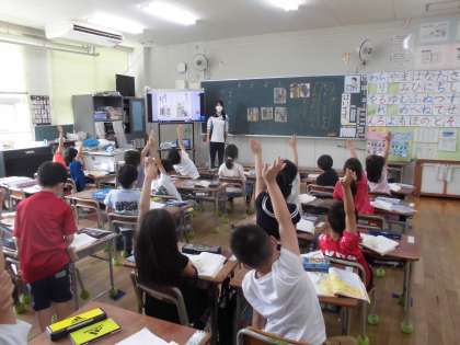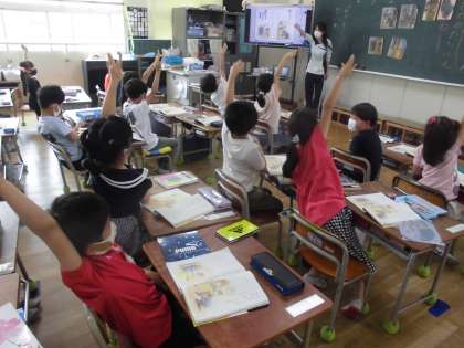 1年生は初めての物語文「とん こと とん」を学習しています。初めて習う物語なので挿し絵をもとにあらすじの順番を確認していきました。