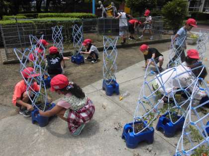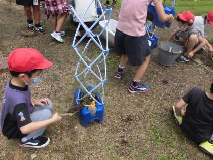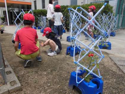 2年生はミニトマトの観察やお世話をしました。暑くなり実が赤くなってきました。雨で流れて減った土を追加していきました。