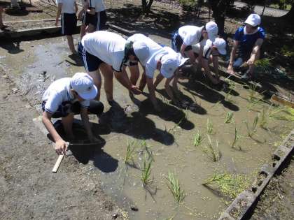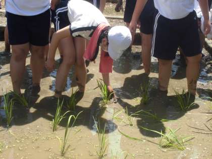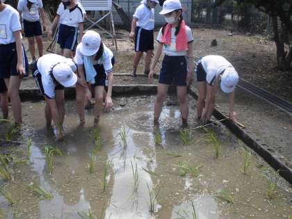 5年生は田植えをしました。この苗は住吉大社からいただきました。子どもたちは裸足で田んぼに入り上手に苗を植えていました。これから子どもたちが田んぼの管理をしていきます。秋の収穫が楽しみです。