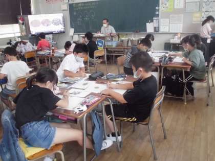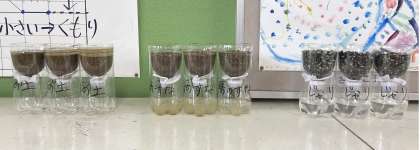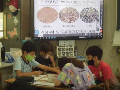 4年生は理科で土の種類によって水にしみこみ方の違いを実験しました。まず土、砂、砂利を虫メガネで観察したり、手で触って感触を確かめました。次にペットボトルに入れて水を注いで違いを確認しました。