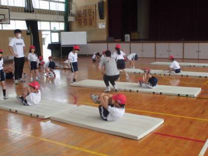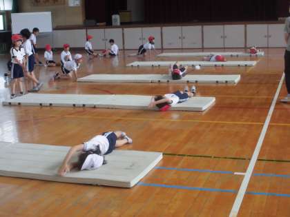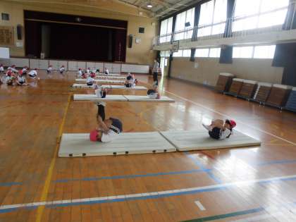 2年生の今日のマット運動はいろいろな技を練習しました。体を伸ばして回ったり、だるまさんのように丸くなっていきました。
