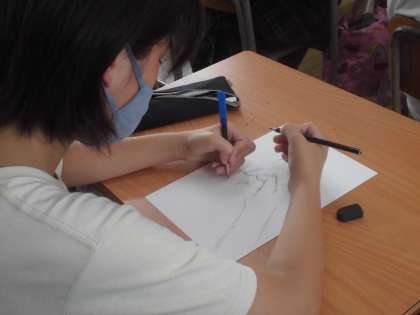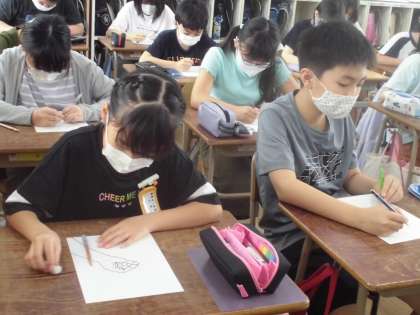 6年生は鉛筆を持った手を描きました。「6年生ならすぐに描ける」と思いますが、利き手で普段持っている状態を描きました。したがって、絵を描いていく手は利き手と逆です。これには子どもたちも苦労していました。
