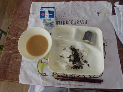 6月22日の給食は「さごしの塩焼き」「みそ汁」「牛ひじきそぼろ」です。そぼろはご飯によく合い、「ご飯が進む」味付けでした。