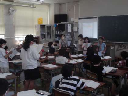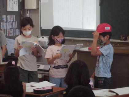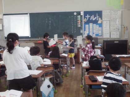 2年生は「名前を見てちょうだい」の物語を学習してきました。まとめの学習で、登場人物の役を決めて発表していきました。物語文を読む役も決めて、発表していきました。写真の赤帽は、物語で登場人物がかぶります。
