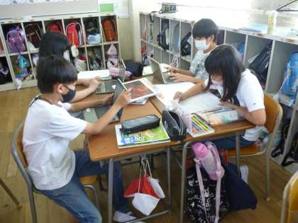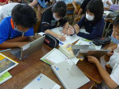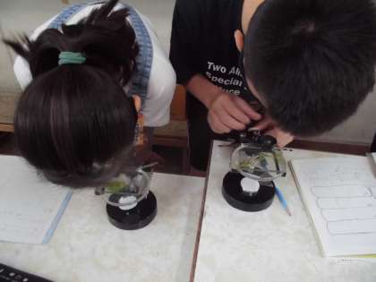 5年生は理科の学習でメダカを飼っています。卵を産みましたので、解剖顕微鏡で観察しました。また、「人のたんじょう」の学習でわかったことをグループでまとめていきました。