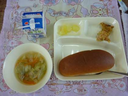 6月23日の給食は「カレードリア」「豚肉とキャベツのスープ」でデザートに缶詰のリンゴがでました。「カレードリア」は大人気の献立で、カレー味がよく生かされていました。