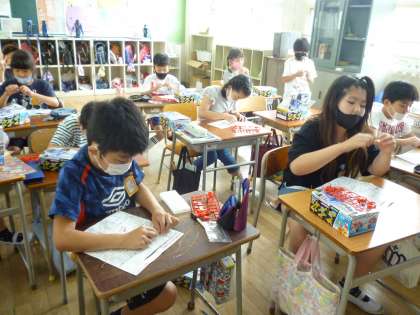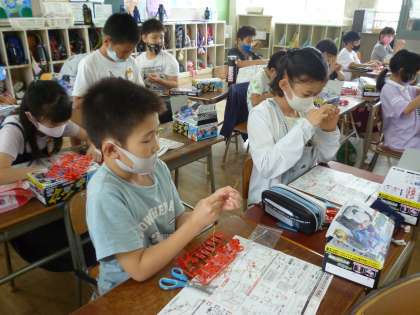 4年生は理科で電池の直列や並列など、電気について学習します。今日はその実験装置を組み立てました。導線のビニルをはがすなど着々と組み立てていきました。