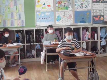 4年生はマラカスなど打楽器を使う学習をしました。いろいろな種類の打楽器を体験でき、音楽に合わせて演奏していきました。手拍子と打楽器でリズムをうまくとって演奏しました。