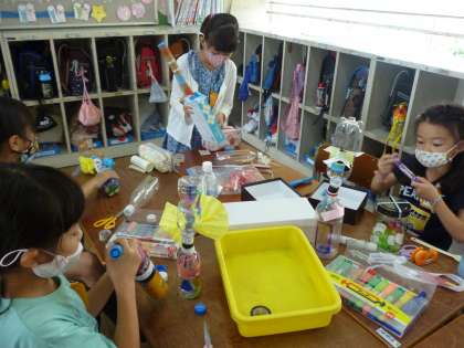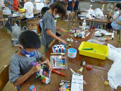 2年生はペットボトルや空き缶などの家庭で使った容器を使って楽器を作りました。容器の中にストロー片を入れて打楽器にしたり、輪ゴムを使って弦楽器にしたり工夫して仕上げていきました。