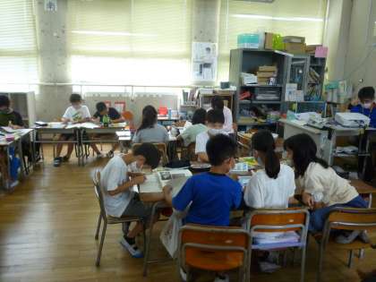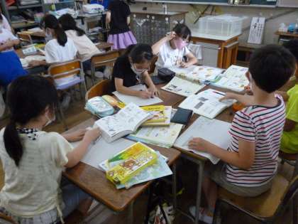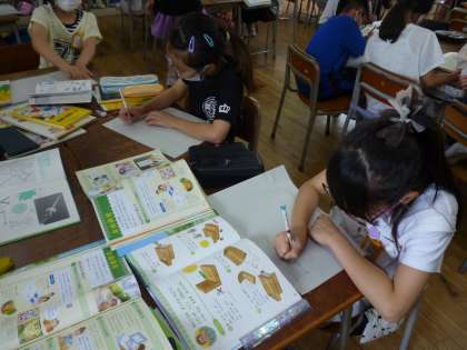3年生は「風やゴムで動く車」で実験をしてきました。その学習の発展として図書館の本を参考に風やゴムで動くおもちゃの作り方を調べ、用紙に書いていきました。
