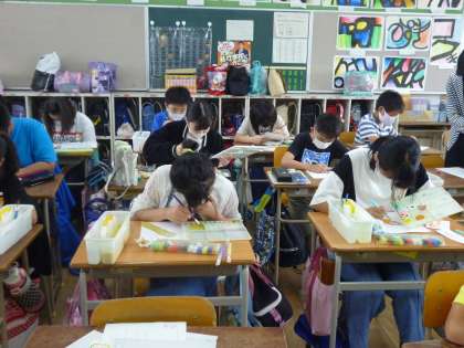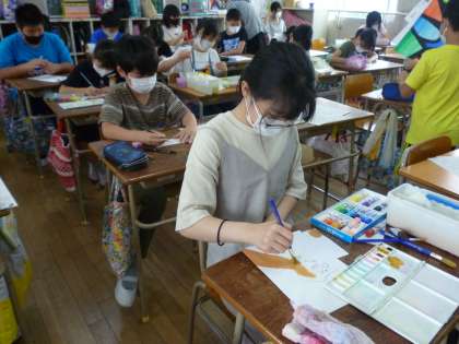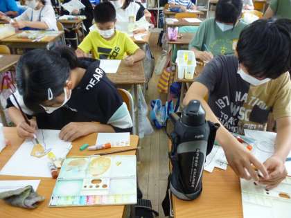 6年生は鉛筆を持つ利き手を描いています。下絵ができたので手に絵の具で着色していきました。混色を工夫してていねいに塗っていました。
