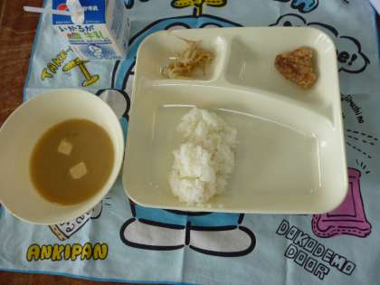 7月8日の給食は「豚肉の香味あげ」「みそ汁」「もやしのおひたし」です。「豚肉の香味あげ」は歯ごたえよくおいしくいただきました。
