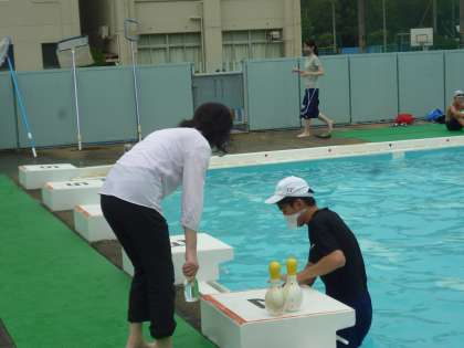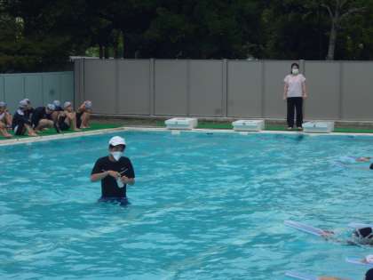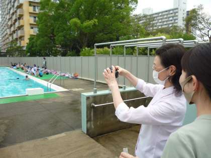 今日は学校薬剤師の方に来ていただき、プールの水質検査をしていただきました。子どもたちがプールに入っている時の水を検査します。教員がプールの中央部から採取した水を検査してもらいました。結果は後日にわかります。