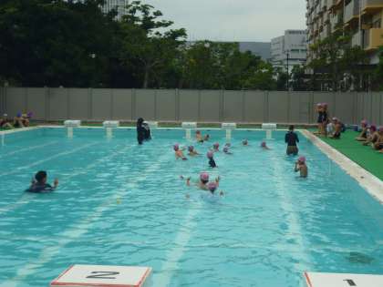 先週の金曜日にプールの水質検査を実施したことをお知らせいたしました。その結果の連絡が学校薬剤師先生からあり、「プールの水質は問題がなく、安全です」とのことです。そのプールで1年生と2年生が顔をつけながら水泳学習をしました。