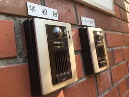 学校は不審者対策のために、正門は施錠されています。通用門のインターホンからご用件をお伝えいただいて職員室からオートロックを開錠するシステムになっています。より鮮明に、来校者の確認ができるように、学校、いきいき教室ともにインターホンを新しいものに取り替えました。